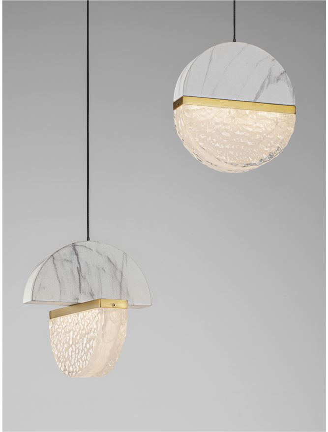 - White Marble-Look Aluminium, Brass Gold Metal & Clear & White Cloud Glass Matt Black Metal Base